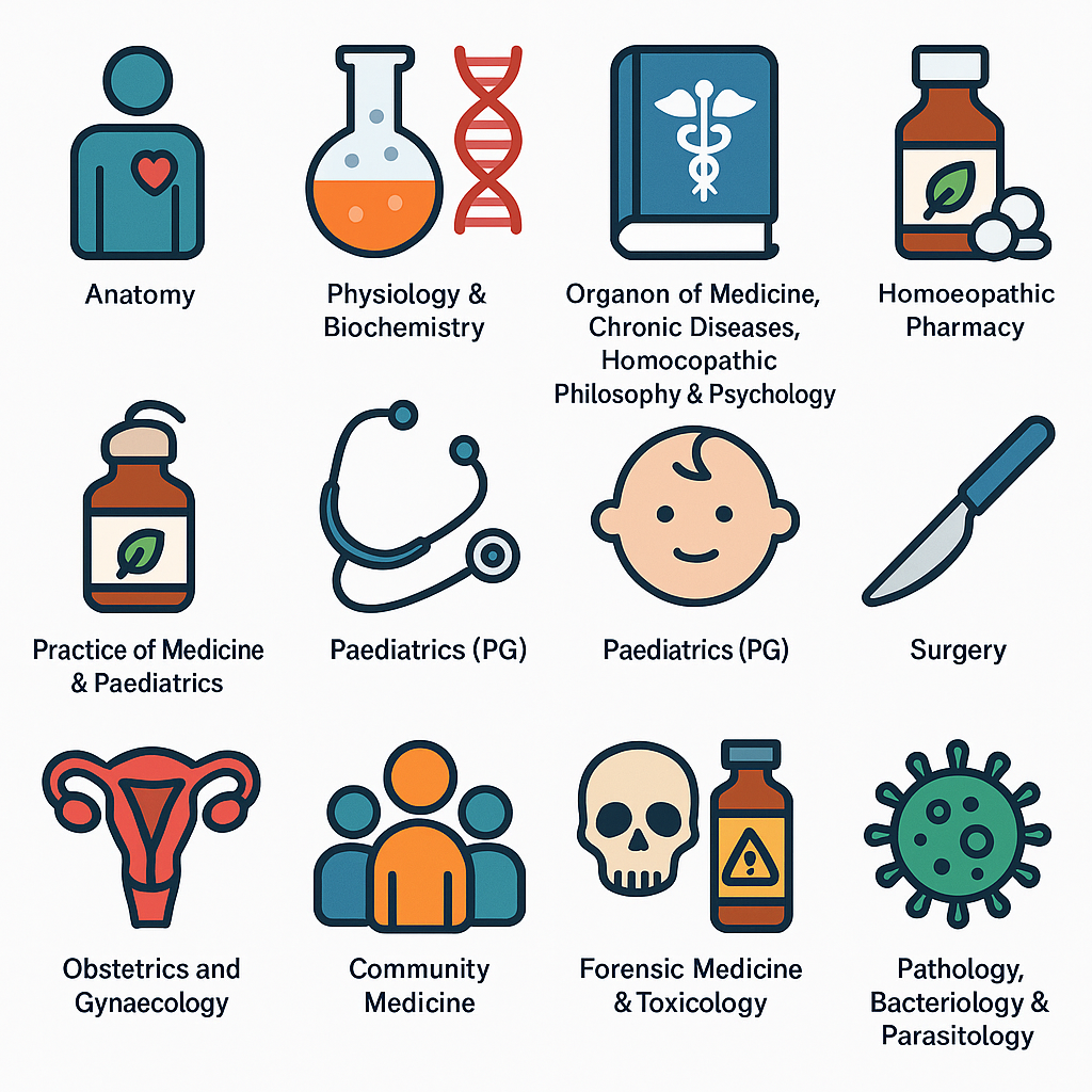 Practice of Medicine in Homoeopathy involves the study and management of various acute and chronic diseases using homoeopathic principles. It emphasizes understanding the disease process, observing the totality of symptoms, and selecting remedies that stimulate the body's natural healing. Paediatrics in Homoeopathy focuses on treating children holistically—from infancy through adolescence. It addresses common childhood issues like infections, allergies, behavioral problems, and developmental disorders, using gentle, non-toxic remedies that support the child's overall growth and immunity. Together, these areas ensure a comprehensive and individualized approach to patient care across all age groups.